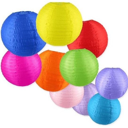 Set van 10 nylon lampionnen in verschillende kleuren - ook geschikt voor buitengebruik.
