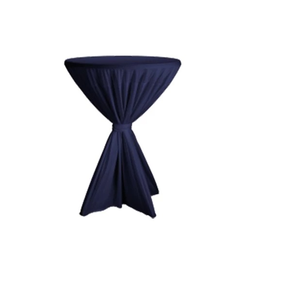 Statafel rond met tafelblad diameter van 85 cm, met klassieke statafelrok, geplooid model met strik in de kleur blauw.